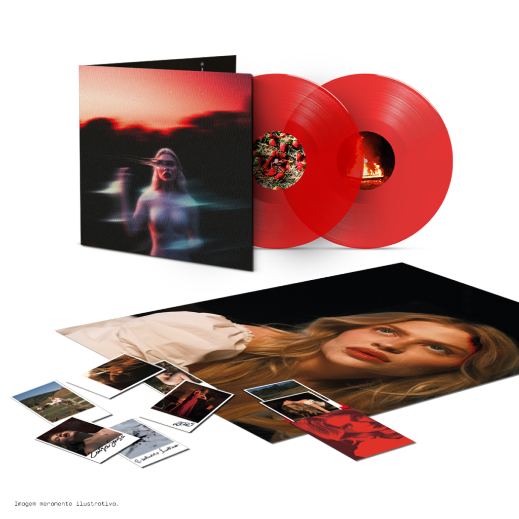LP duplo vermelho opaco, capa gatefold, pôster e envelope com polaróides