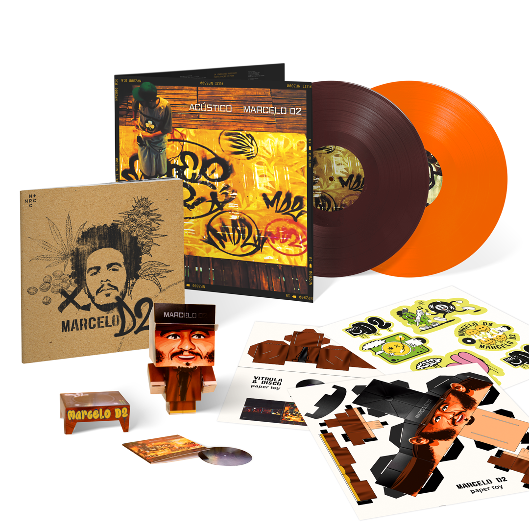 LP duplo laranja opaco e marrom translúcido, capa gatefold, livreto, paper toy e adesivos