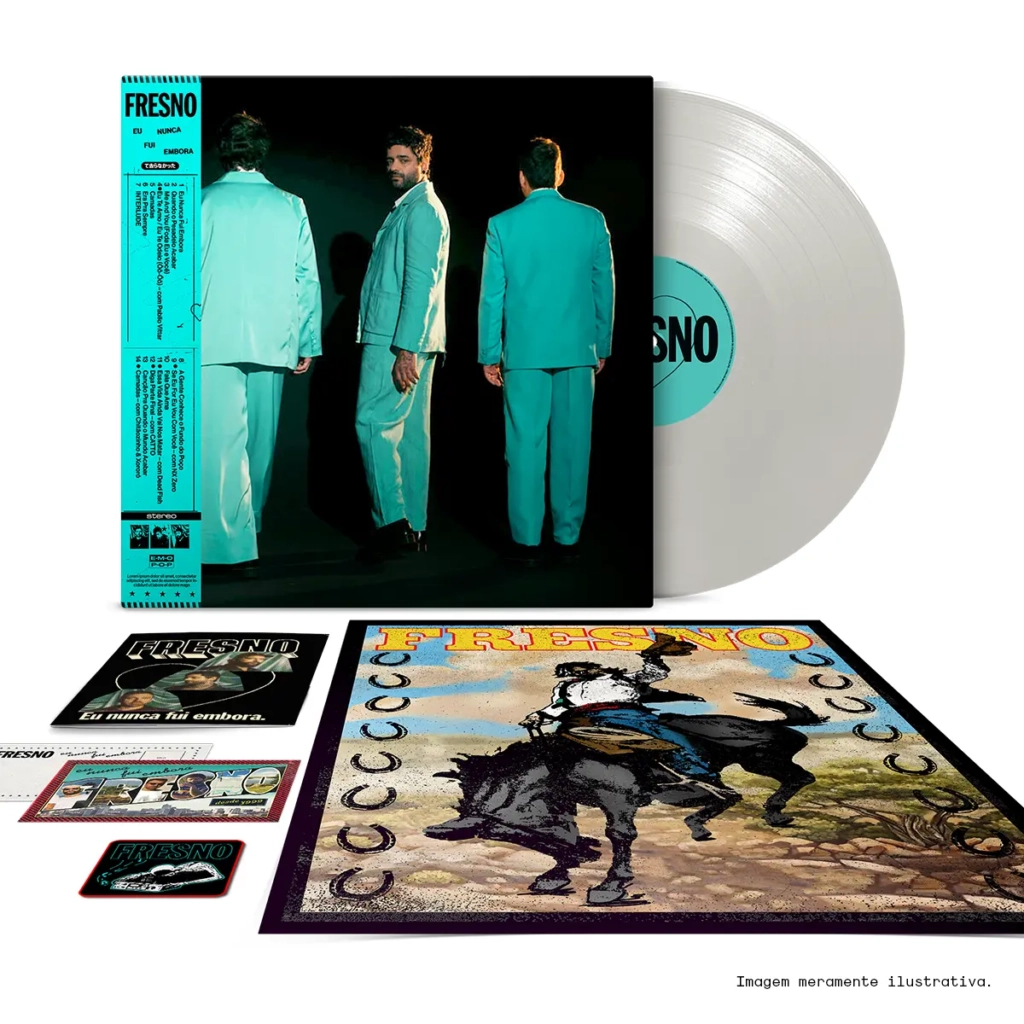 LP branco marmorizado, capa gatefold com cinta, fanzine, pôster, patch e cartão postal