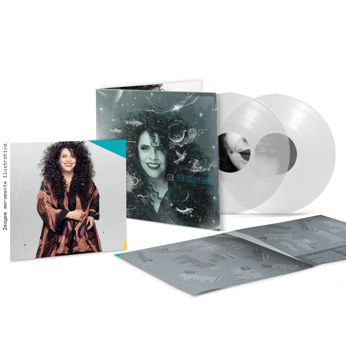 LP duplo translúcido, capa gatefold e capa de plástico ilustrada