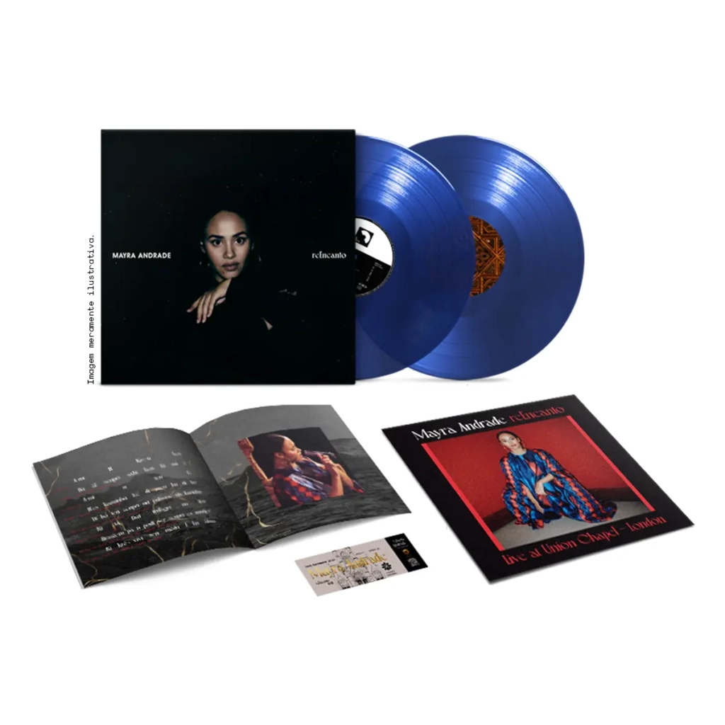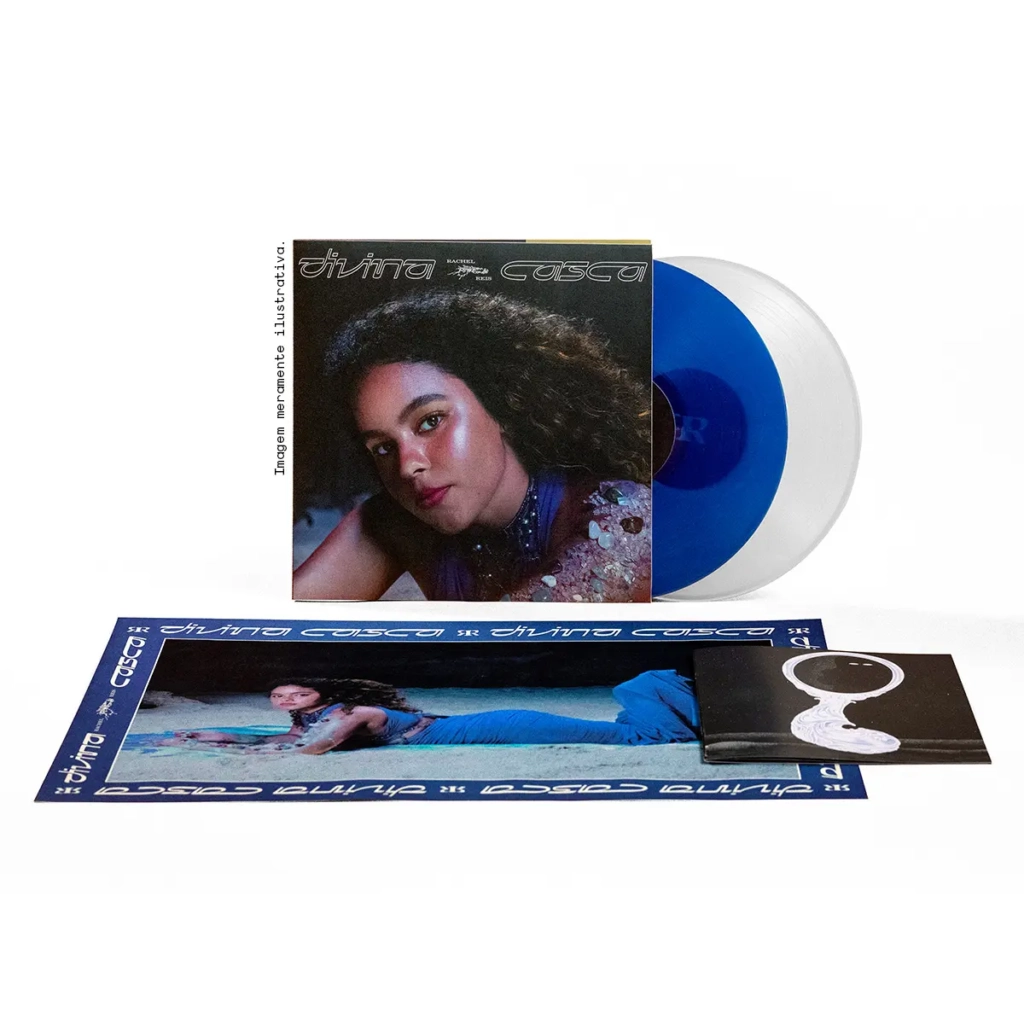 LP duplo azul translúcido, translúcido, capa gatefold, livreto ilustrado com poema e pôster