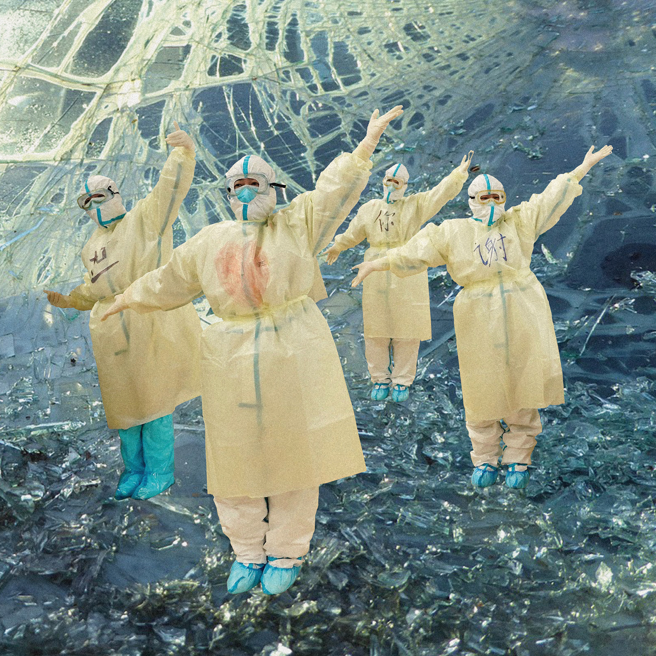 Essa colagem é de uma foto jornalística, super impactante, onde enfermeiros estão fazendo exercícios entre os atendimentos. Um momento de pausa frente à tragédia e ao horror, tudo isso com cores sutis. - Mateus Acioli