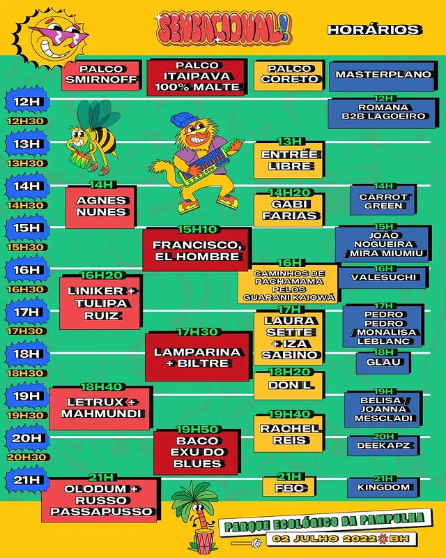 Em meio a uma zona de 30 hectares de área verde, Belo Horizonte recebe o Festival Sensacional no Parque Ecológico da Pampulha (Av. Otacílio Negrão de Lima, 6061 - Pampulha, Belo Horizonte). Ocupando pela primeira vez a esplanada gramada, o coreto e o bosque do parque, o evento terá dez horas de duração no dia 2 de julho.