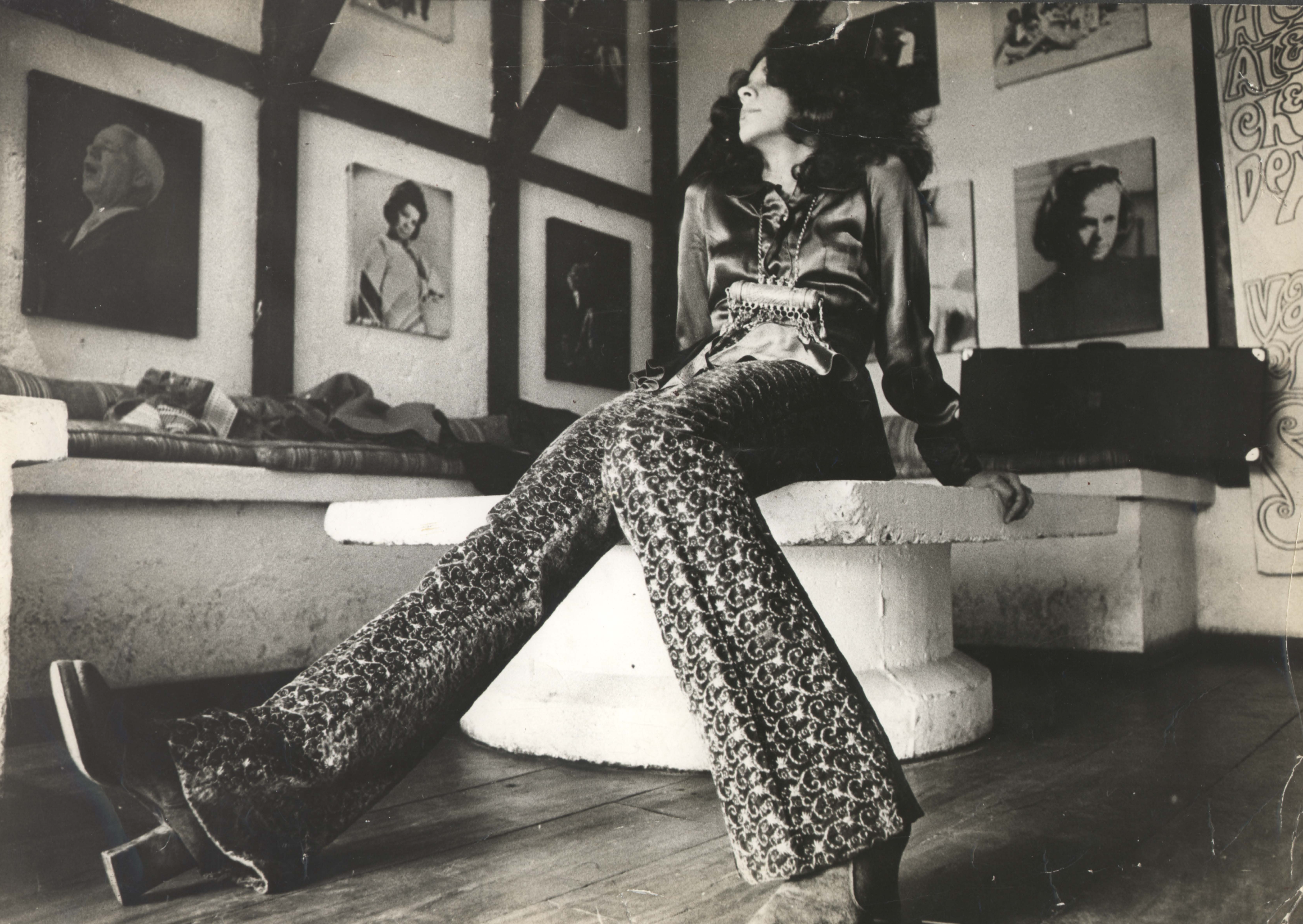 Setenta ainda, vem o show de Índia. O vestido vermelho-sirene, de franjas longas, brilhantes, brilhantes. Flores no cabelo, duas, aquelas emparelhadas que voltariam na capa de Tropical, isso correu o Brasil. Mas uma foto, ah essa foto: topzinho franzido, uma saia de babados, banquinho, violão, a roupa enrodilhada naquilo tudo, as ondas do tecido formando folha, cauda de sereia.