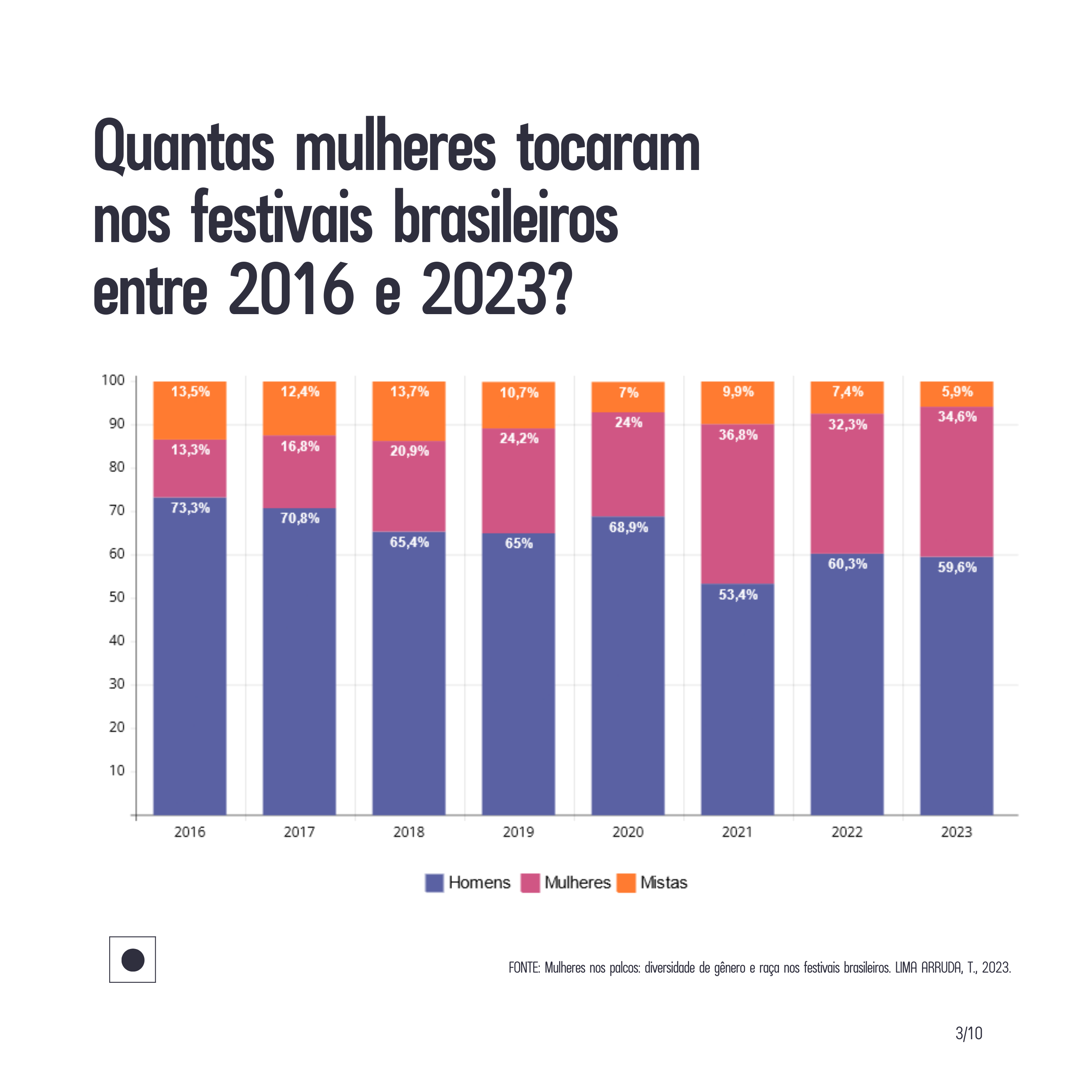 Dos eventos realizados no ano passado, apenas quatro festivais atingiram 50% de presença feminina: Favela Sound, em Brasília, Saravá, em Florianópolis, La Folie Fest, no Recife, e Rock The Mountain, no Rio de Janeiro. Veja mais dados: