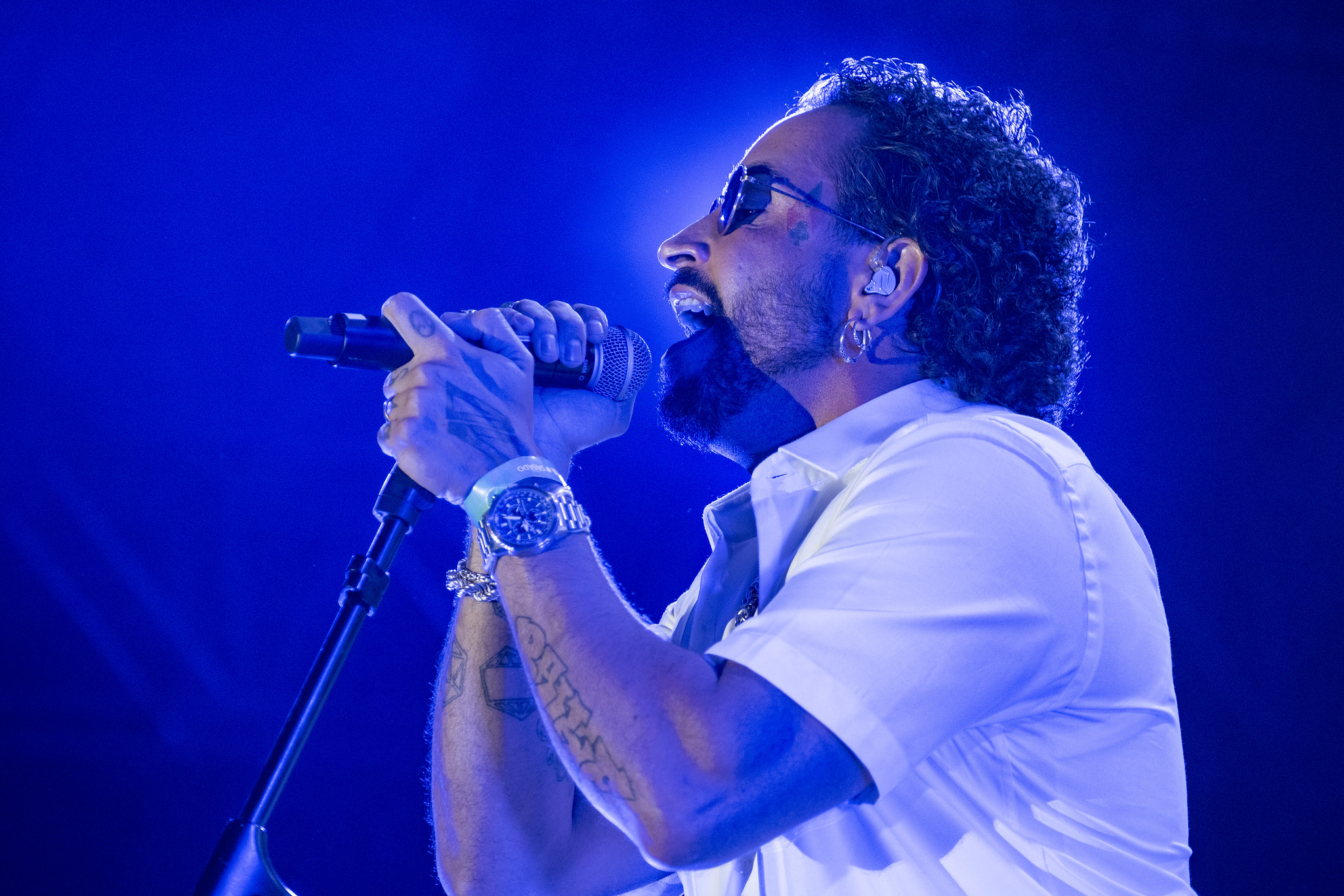 No entanto, a partir do momento em que três adjetivos já bem conhecidos ecoaram na faixa “Se Tá Solteira”, as texturas entre rock, rap, soul, disco e MPB se mesclaram e se intensificaram em múltiplas direções. Com uma sonoridade sombria, pesada e densa em camadas, o artista cantou clássicos do álbum “Baile”, como “De Kenner” e “Polícia Covarde” em uma roupagem mais rock. Juntou-se à família no palco e distribuiu sandálias Kenner e garrafas de água à plateia.