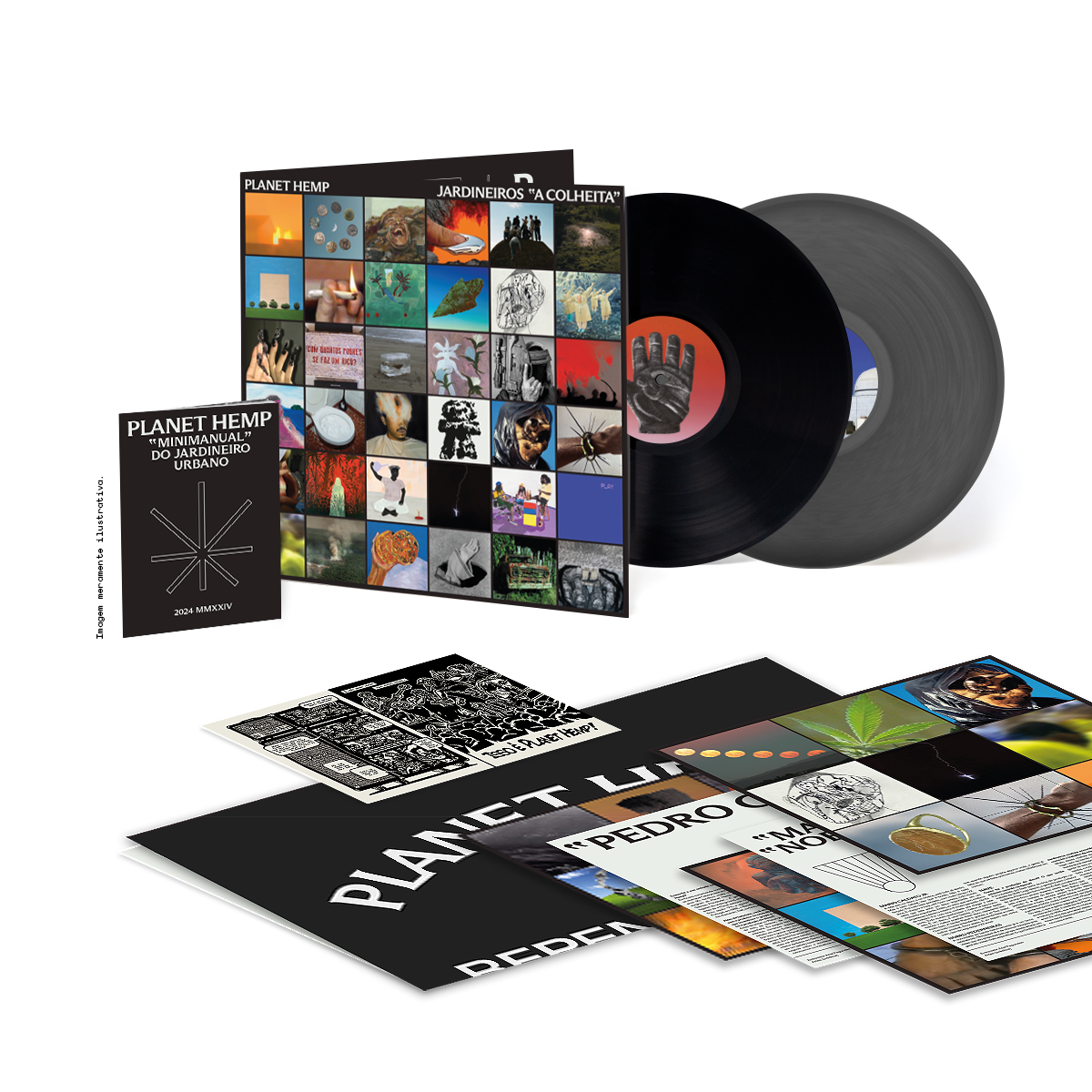 LP duplo cinza e preto, capa gatefold, HQ, manual de jardinagem e cards com entrevistas